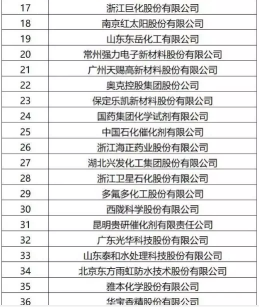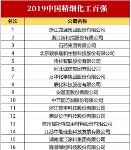 2019年11月28日,在由全国精细化工原料及中间体行业协作组、中国化工情报信息协会在广西北海联合主办,中国化工信息中心承办,北海市铁山港区人民政府、北海市铁山港(临海)工业区管理委员会协办的“第十九届国际精细化工原料及中间体(铁山港)峰会暨2019中国精细化工百强发布会”上,公布了“2019中国精细化工百强”榜单。
